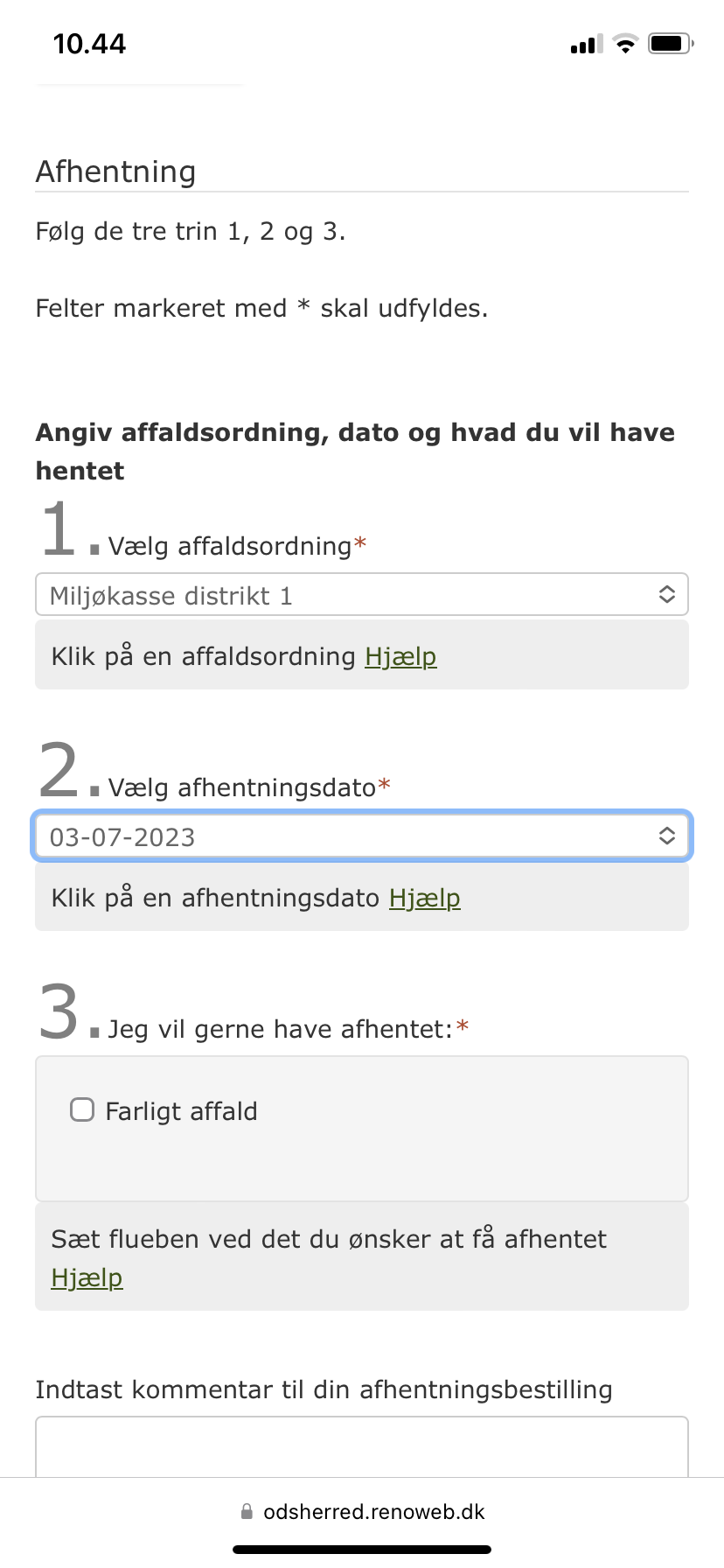 - Bestil afhentning af Stort Indbo og Tekstilaffald (senest tre hverdage før)